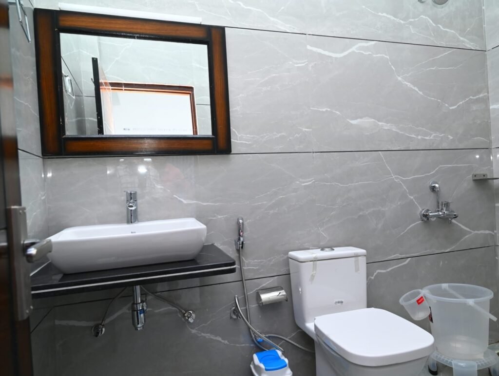 At Hotel DAIWARCH, every room comes with a well-maintained private bathroom designed for cleanliness and functionality. Featuring elegant grey wall tiles, a sleek countertop washbasin, Western-style toilet, and essential fittings like a mirror, shower, and running water supply, our bathrooms ensure a comfortable and hygienic experience for every guest.